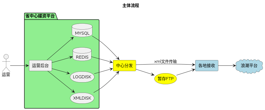 @startuml left to right direction title 主体流程 actor 运营 folder 省中心媒资平台 as center #lightgreen{ rectangle 运营后台 database MYSQL database REDIS storage LOGDISK storage XMLDISK } 运营-->运营后台 运营后台-->REDIS 运营后台-->XMLDISK 运营后台-->LOGDISK 运营后台-->MYSQL rectangle 中心分发 #yellow rectangle 各地接收 #lightblue storage 暂存FTP #yellow cloud 浪潮平台 #lightblue REDIS-->中心分发 MYSQL-->中心分发 XMLDISK-->中心分发 LOGDISK-->中心分发 中心分发-->各地接收:xml文件传输 中心分发-->暂存FTP 各地接收-->浪潮平台 暂存FTP-->各地接收 @enduml